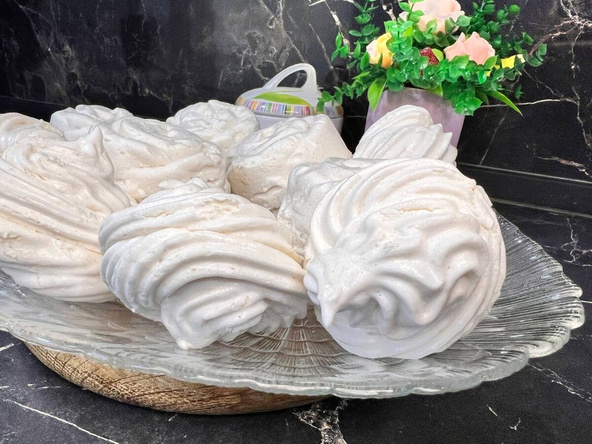 Ингредиенты: - Вода — 100 мл - Агар-агар — 10 г - Лимонный сок — 1 столовая ложка - Сахар — 80 г (разделенный) - Яблочное пюре — 150 г - Белок яйца — 2 шт. - Щепотка соли Инструменты: - Сотейник - Венчик - Чаша для смешивания - Кондитерский мешок с насадкой - Противень - Силиконовый коврик Процесс приготовления: Подготовка основы 1. Возьмите сотейник и добавьте в него 100 мл воды вместе с агар-агаром (10 г). Перемешайте и оставьте на 5 минут для набухания агара. Добавление лимонного сока 2. Отрежьте небольшой кружок лимона и выжмите сок в отдельную емкость. Нам понадобится около одной столовой ложки. Варка сиропа 3. Верните сотейник с водой и агар-агаром на плиту. Добавьте сахар (70 г) и яблочное пюре (150 г). 4. Постоянно помешивайте венчиком, доведите смесь до кипения и дайте ей прокипеть одну минуту. Масса начнет загустевать. Взбивание белков 5. Перелейте белки от двух яиц в чистую сухую миску и слегка посолите. Начните взбивать венчиком до образования густой белой массы. 6. Пос