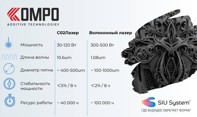 Выбор лазера в SLS-системах — это не опция, а стратегическое решение. Посмотрим? CO₂ лазер. Длина волны 10,6 мкм оптимально поглощается большинством полимеров. Это надежный рабочий инструмент, когда важна стабильность процесса и не требуется экстремальная детализация. Волоконный лазер. Длина волны 1,08 мкм позволяет фокусировать пятно до 100 мкм. Меньшее пятно = выше точность контуров и возможность работы с более тонкими слоями. Волоконный лазер обеспечивает равномерность энергии по всему пятну. ⚙ Точность: Волоконный лазер дает более острые кромки и четкие геометрии ⚙ Скорость: Мощные волоконные лазеры спекают материал быстрее ⚙ Энергоэффективность: КПД волоконного лазера в 3-4 раза выше, чем у CO₂ ⚙ Универсальность: CO₂ лучше справляется с некоторыми спец. материалами Открытость SLS-систем KOMPO Additive Technologies - это выбор лазера под конкретную задачу: CO₂ для серийного производства стандартных деталей, волоконный — для высокодетализированных изделий и скоростной печати.