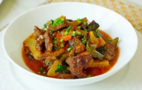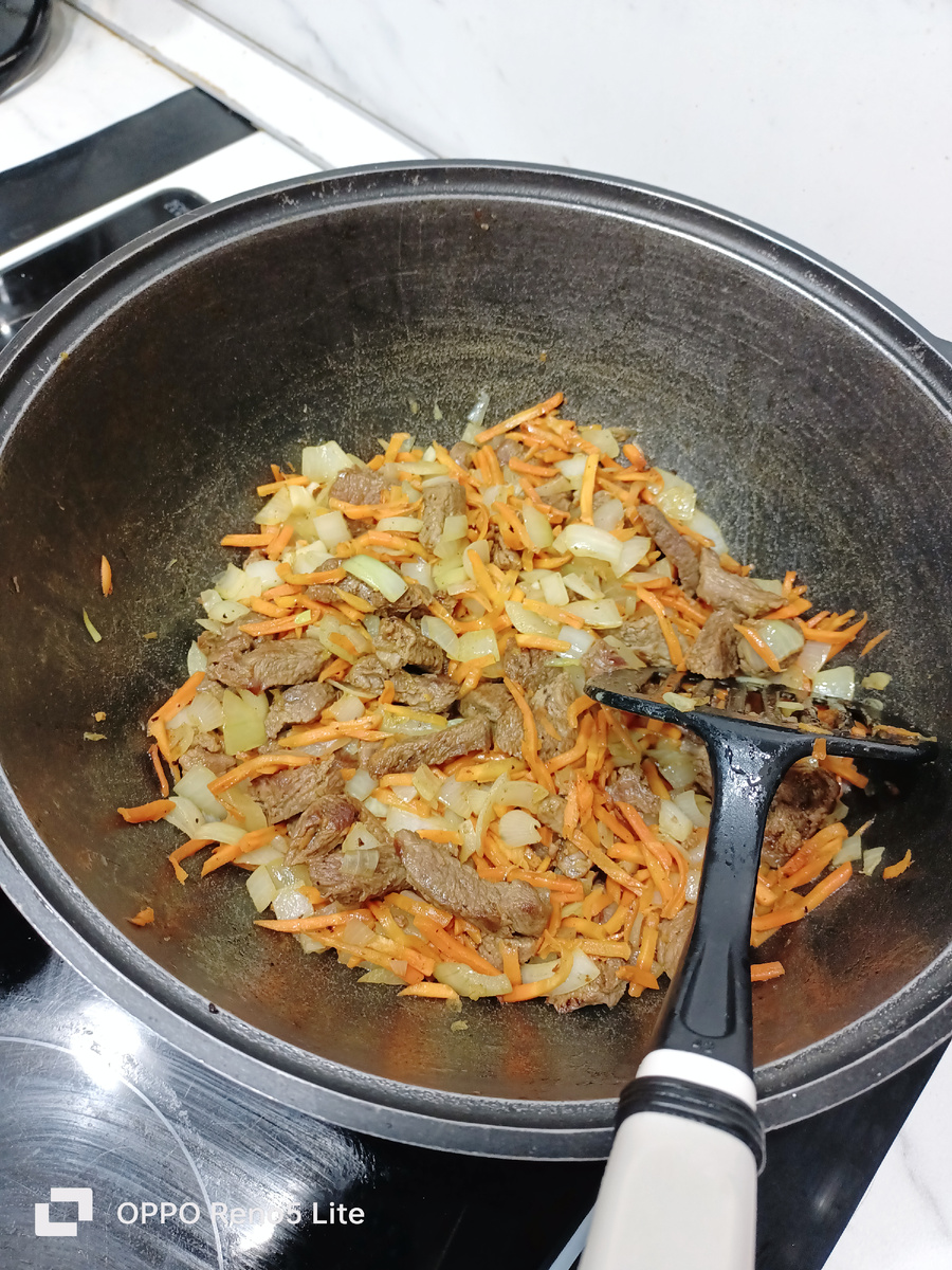 Утварь: Казан от 5 литров и сковорода с высокими бортиками. Продукты: Мякоть говядины - 0,7 кг; Картофель - 10 средних (так, чтобы влезло на сковородку); Соленые огурцы - 4 средних или 7 корнишонов; Лук - три средних луковицы; Морковь - три средних; Помидоры - 3 средних или 5 сливок; Томатная паста и подсолнечное масло -примерно по 100 грамм; Черный перец молотый и соль - по вкусу; Зелень в тарелки по желанию. Приготовление: Я не профессионал, поэтому предпочитаю сначала все нарезать, а потом жарить-парить). 1. Картофель начистить и нарезать брусочками, как для "фри" и положить в кастрюлю с водой, чтобы не заветривался. Лук очистить и нарезать на мелкие кубики, морковь натереть на терке (лучше взять тёрку для корейской, но морковь держать, как обычно - перпендикулярно). Огурцы порезать на нетолстые полоски, по паре сантиметров длиной. Помидоры порезать на небольшие ломтики. Мясо порезать на недлинные полоски (как для бефстроганова). 2. Влить немного подсолнечного масла в казан и п