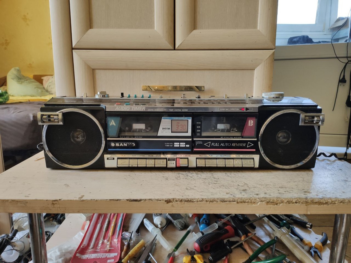 Sanyo M W 790K.Батончики нынче в топе или посвящается тем, у кого уже благородная отрыжка с амбре, от трёх топоров.😎Некоторые стали понимать, что магнитола с ручкой, в первую очередь должна быть удобно носимой, а не бандурой хрено подъемной, в которой всё равно особо звука нет. 😏Захотелось экзотики, нашёлся экземплярчик, только вот беда, совсем молчит, тишина, звука нет, будем разбираться. Вскрываем, следы попыток ремонта видны, пытались паять в районе микросхемы УНЧ, ну на этом видимо всё, выдохлись и хорошо. Замеряем и сразу КЗ на банке питания, но повезло, дело не в выходной микросхеме УНЧ, замеряем дальше, а КЗ по 12-ти вольтам у нас оказывается на левой протяжке, плюс выгоревший транзистор по питанию🤨.Схемы нет, тем веселее заниматься реверс инженерингом, выяснилось, что в КЗ, соленоид системы поиска по паузам и тут опять повезло, КЗ оказалось на проводах, прям у ввода в катушку, а не где-нибудь внутри витков.