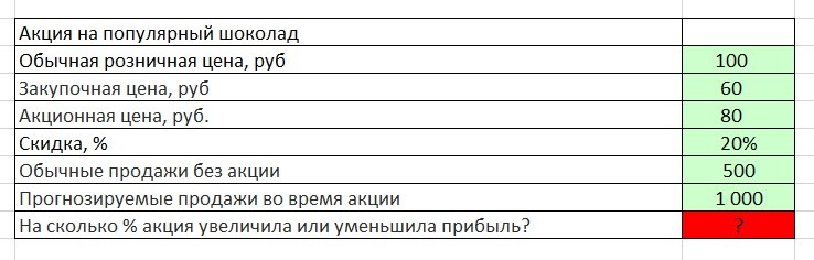 Задачка по промо-акции Дано: Акция на популярный шоколад. Обычная розничная цена: 100 руб. Закупочная цена: 60 руб. Акционная цена: 80 руб. ("Скидка 20%!"). Обычные продажи без акции: 500 шт. в неделю. Прогнозируемые продажи во время акции: 1000 шт. в неделю. Вопрос: а) Рассчитайте прибыль за неделю БЕЗ акции. б) Рассчитайте прибыль за неделю С акцией. в) На сколько % увеличилась или уменьшилась прибыль от продаж товара? #промоакция #скидка #маркектинг #акционнаяцена #прибыль