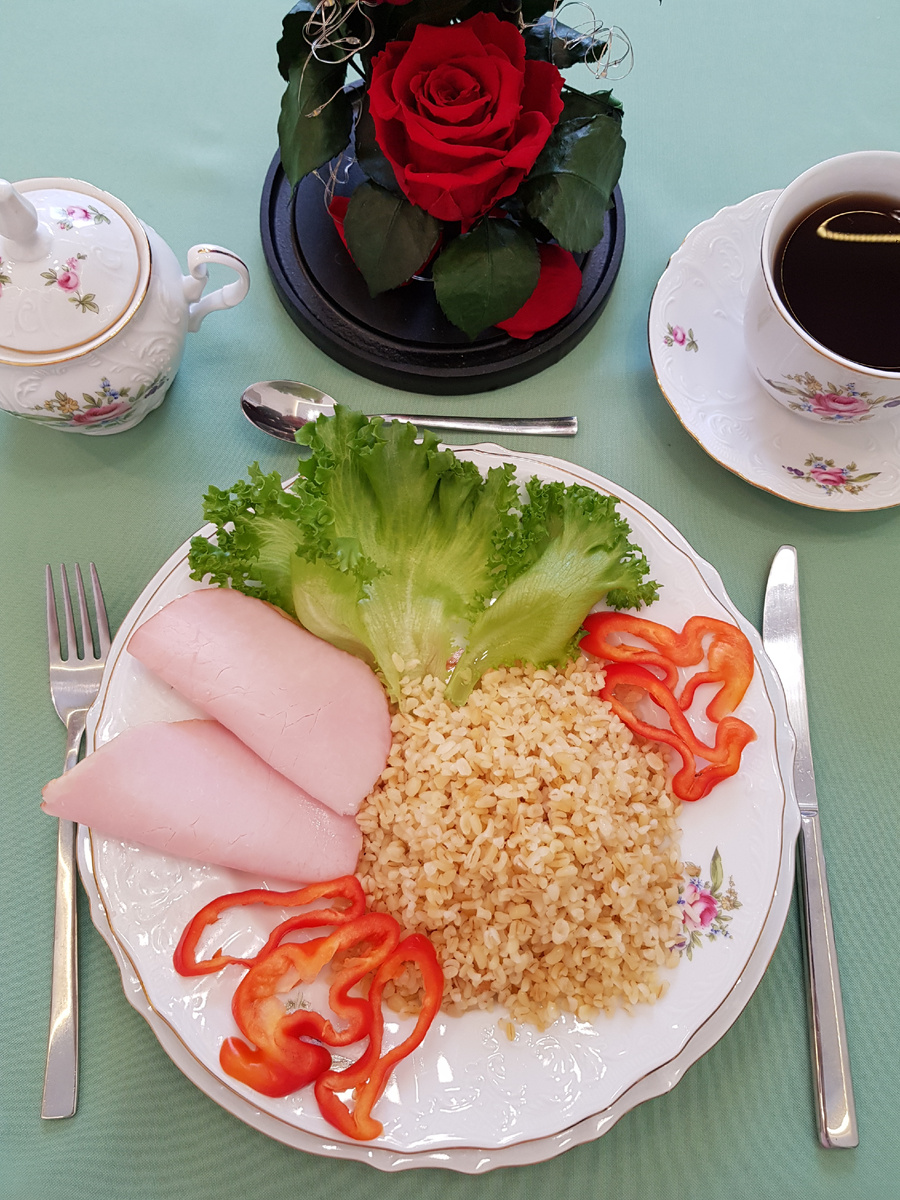 Добрый день, дорогие друзья! Сегодняшний я предлагаю начать с ароматной, рассыпчатой каши из булгура. Для приготовления 3 порций нам понадобятся: булгур 200 грамм, вода 400 грамм, масло растительное 15 грамм, соль 3 грамма. Для оформления 3 порций нам понадобятся: 300 грамм карбонада, 50 грамм листьев салата, 50 грамм сладкого перца. Приготовление: булгур промыть в холодной воде и откинуть на мелкое сито. Высушить промытый булгур заранее. В кастрюлю с толстым дном налить растительное масло и высыпать булгур, обжарить на среднем огне в течение 2 минут. Посолить, перемешать. Налить воду, довести, помешивая, до кипения, уменьшить огонь до минимального уровня, накрыть крышкой. Варить в течение 30 минут, не перемешивая. Булгур, приготовленный с маслом, остается рассыпчатым. Разложить булгур по тарелкам, дополнить ломтиками ветчины, свежим сладким перцем и листьями салата. Приятного аппетита!