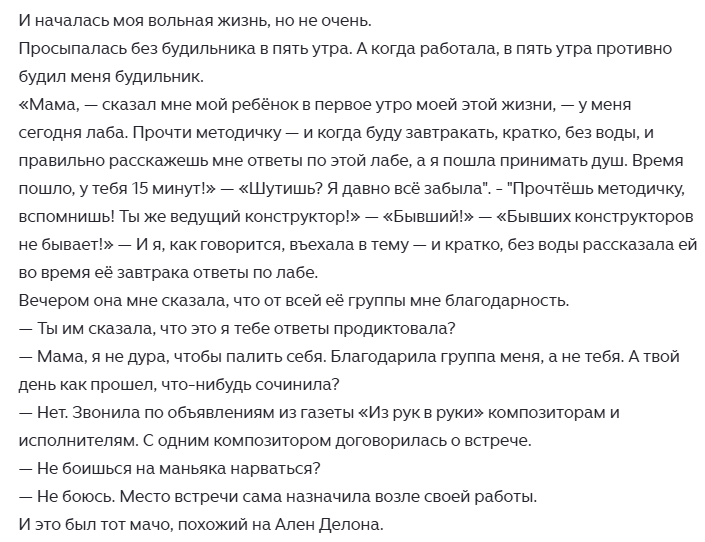 Мне надоело работать и я уволилась. Скан этой статьи Начало в статье Он был настоящим мачо, или Ален Делон... Тексты песен не всегда писались — и я решила написать роман. И писала его, наверное, год. Можно было и быстрей, но писала его на даче, а там дачные дела — и я ещё часа четыре играла в Цевелизацию.