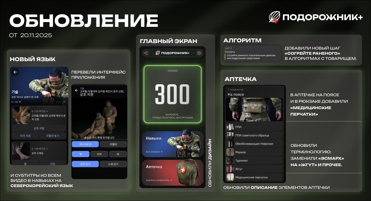 ➕ Обновлен дизайн главной страницы ➕Новый шаг «Согрейте раненого» в алгоритмах с товарищем ➕ Заменен термин «Эсмарх» на «Жгут» ➕«Медицинские перчатки» в аптечке на поясе и в рюкзаке ➕ Обновлено описание элементов аптечки ➕ Добавлен северокорейский язык 🇰🇵 Обновляйся | https://подорожникплюс.рф/ Поддержка ТГ | @pplus_support ТГ | @podoroZnikRF 🪖