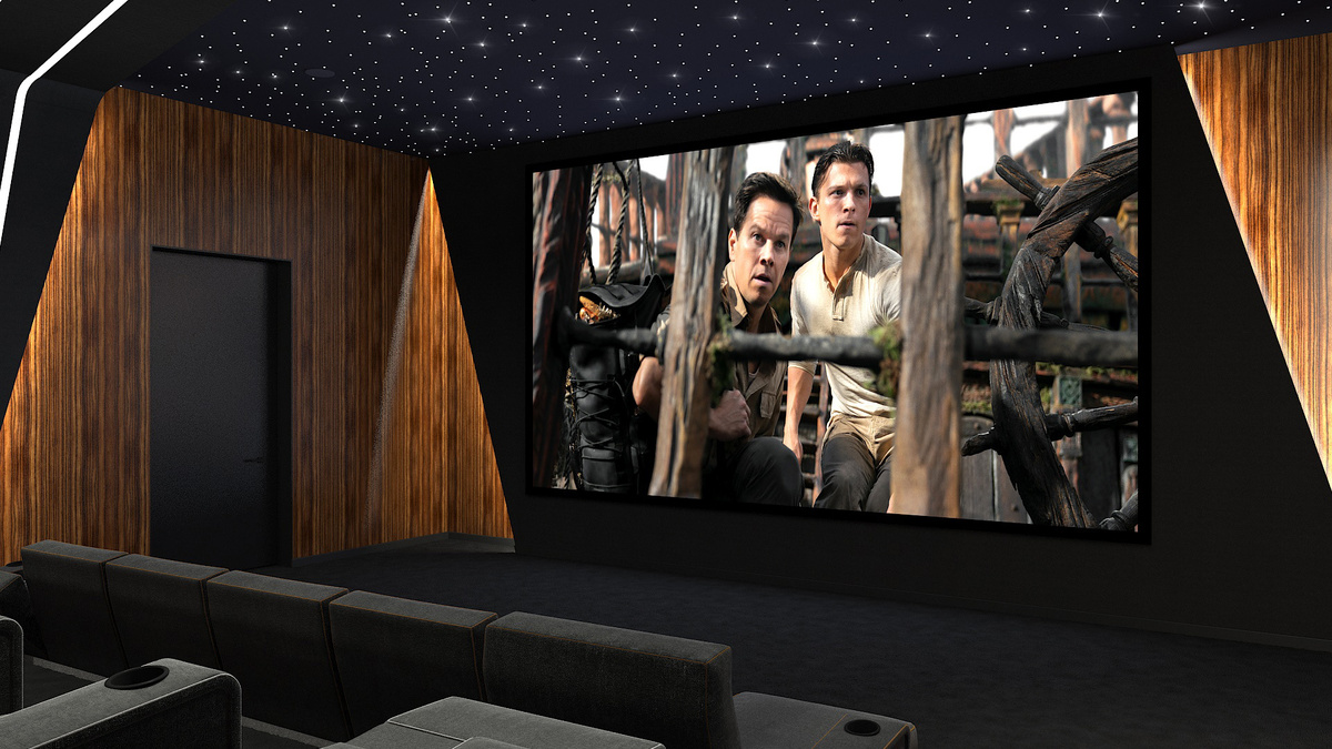 Название проекта: Новокузнецк Тип: Частный дом Место: Новокузнецк, Кемеровская область, Россия Авторы: ARTINSTALL& Евгения Егорова Звук: 7.4.4 Дом заказчика расположен в пригороде Кемерово. Это соседняя область с нашим новосибирским филиалом. Место для кинозала выбрано в цокольном этаже дома, рядом расположены зоны бильярда, караоке и бара. Площадь кинозала приличная, 72м2. В сочетании с очень высокими потолками – особое внимание подбору акустических систем и сабвуферов. Для реализации кинозала нас пригласил дизайнер дома, он же и является автором концепции дизайна. Мы адаптировали всю инженерную «начинку» кинозала под ее желаемые визуальные образы. Дизайн — асимметрия и динамика. Контрастность по цвету. Материалы на стенах – деревянные перфорированные акустические панели «зебрано» + тканевые элементы. Материалы на потолке – ГКЛ под покраску и натяжной потолок «звёздное небо» из акустической ткани. Материалы на полу – ковролин, с требуемой акустикой высотой ворса. Освещение кинозала: