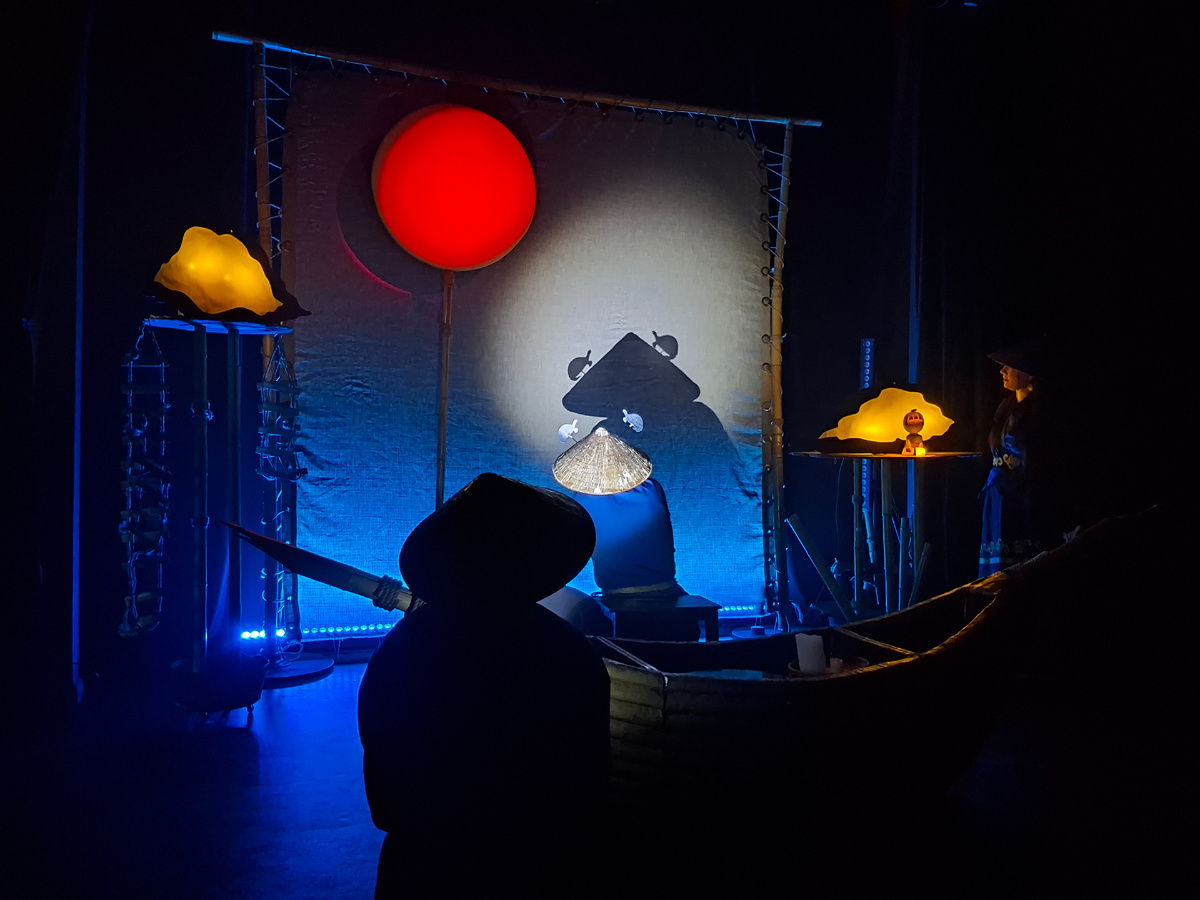 С первых секунд нас окутала атмосфера Китая. Маленькая деревушка у реки с аутентичными лесенками. Бамбуковые декорации, полная луна, соломенные крыши домов, по середине сцены лодка, наполненная настоящей водой... 🎎Мы полностью погружены в китайский колорит. Актёры в треугольных соломенных шляпах, передвигаются плавно мелкими шажками. В зале приглушенный свет, китайские мелодии, напевы, шепот и плеск воды нарушают тишину... 🐲В роли жителей выступают китайские деревянные миникуколки кокэси. Каждый житель прячется в своём домике с соломенной крышей и ждёт прихода Лунного дракона. 🐲Когда-то давно жители разгневали Лунного дракона, за что в наказание взошла полная луна и наводнение накрыло деревню. 🐲Как они разозлили дракона уже никто и не помнит. Каждый месяц все боятся, прячутся, с ужасом ждут и отсчитывают дни до прихода Лунного дракона. 🎎Лишь маленькая девочка Джу не разучилась смеяться и наслаждаться жизнью. 🎎Джу отправилась высоко в горы к мудрецу Джа узнать легенду о Лун