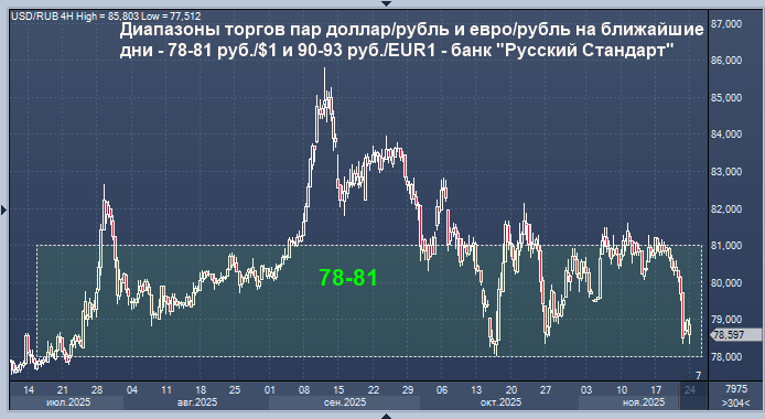 Диапазоны торгов пар доллар/рубль и евро/рубль на ближайшие дни - 78-81 руб./$1 и 90-93 руб./EUR1 - банк "Русский Стандарт" Курс доллара к рублю расчётный, фьючерс, вечный фьючерс и межбанк. Курс евро к рублю расчётный, фьючерс, вечный фьючерс и межбанк. Курс юаня к рублю биржевой, фьючерс, вечный фьючерс и межбанк. Прогнозные диапазоны для валютных пар доллар/рубль и евро/рубль на ближайшие дни составляют 78-81 руб./$1 и 90-93 руб./EUR1 соответственно, говорится в комментарии директора департамента операций на финансовых рынках банка "Русский Стандарт" Максима Тимошенко. Эксперт отмечает, что в фокусе находятся аккуратные сигналы по очередным перспективам снижения градуса геополитической напряженности. При этом рассчитывать на поддержку от нефтяных цен рублю в ближайшие дни скорее не приходится на фоне тренда на их снижение, чему может способствовать геополитическая деэскалация, а также давление на поставки российской нефти, указывает он. Оптимизма российскому рынку, по мнению Тимошен