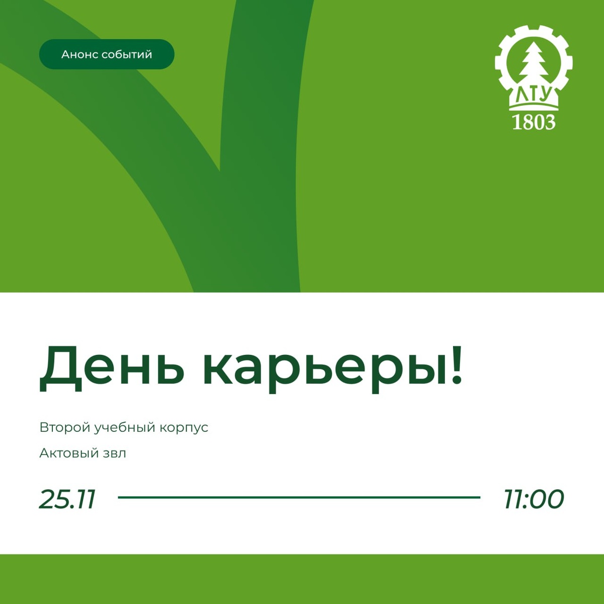 🐱 Готов сделать следующий шаг в профессии? 25 ноября пройдёт главный осенний карьерный старт — День карьеры! Тебя ждёт живая коммуникация с представителями ведущих компаний города и региона: 🤎можно лично задать вопросы, показать резюме и получить обратную связь; 🤎ты узнаешь о стажировках, вакансиях, условиях работы и требованиях к молодым специалистам напрямую от работодателей; 🤎эксперты расскажут о современных трендах в отрасли и поделятся подсказками, какие навыки развивать уже сегодня, чтобы быть востребованным завтра. На площадке будут представлены ключевые предприятия лесной отрасли, открытые к диалогу со студентами. 🗓 Приходи 25 ноября в Актовый зал с 11:00 до 14:00 и используй этот день на максимум. 👋 Не упусти шанс заявить о себе и сделать уверенный шаг навстречу карьере мечты! 👻 МАХ | 📲 ВК | 📝 ДЗЕН