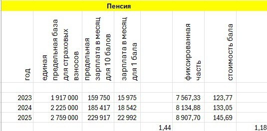 Хотя мне до 65 лет еще далеко, решил сконцентрировать информацию о пенсии. Главная формула, пенсия = «фиксированная часть» + «количество пенсионных баллов»*«стоимость балла». Минимальное количество пенсионных баллов, начиная с которого возникает право на пенсию, 30. Максимальное количество баллов, которое можно заработать за год, 10. На настоящий момент «фиксированная часть» = 8907,70 руб, «стоимость балла» = 145,69 руб. Минимальная пенсия - 8907,70 + 30*145,69 = 13278,40 руб. Максимальная пенсия для мужчин/женщин, если работать с 18 по 65/60 лет с максимальной зарплатой – 8907,7 + 10*48 * 145,69 = 78838,9/71554,4 руб. Каждый год «фиксированная часть» и «стоимость балла» индексируется на величину около уровня официальной инфляции. Все кажется достаточно логичным, но «есть но». Оно связан с тем, сколько нужно зарабатывать, чтобы получить 1 балл. Этот параметр определяется «единой предельной базой для страховых взносов», равной в 2025 году 2 759 000 руб. годовой зарплаты, т.е. 1 б