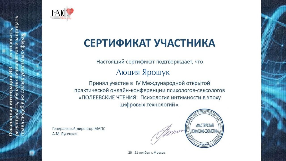 Прошла семинар "Полеевские чтения 2025" — одно из самых значимых ежегодных событий в профессиональном сообществе. Каждый год я сознательно выбираю обучение, чтобы углублять свои знания, усиливать навыки и оставаться максимально полезной для тех, кто ко мне приходит. Хочу выразить огромную благодарность организаторам лекторам и коллегам - за вдохновение, новые смыслы и возможность расти в профессии. Такие встречи наполняют, расширяют и дают невероятный заряд. Теперь я ещё более уверенно и глубоко могу работать с темами, связанными с сексуальностью, интимностью, трудностями в отношениях, потерей желания, страхами, установками и телесностью. 💛 Ко мне можно — и важно — обращаться с вопросами в сфере секса. Я создаю безопасное пространство, где можно говорить честно, без стыда и давления. Здесь вас услышат и помогут разобраться. Если чувствуете, что пришло время понять себя глубже — я рядом.
