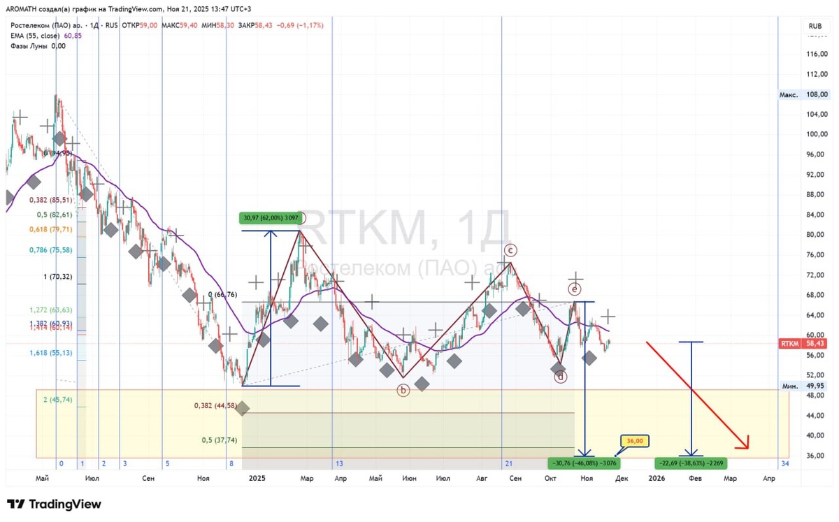 📞 Алло, что со связью? Жду чудо-актив #RTKM Ростелеком на уровни 36-38 ближе к весне. В целом акции исторически неинтересны для Aromath. С текущих возможен сценарий на -38% - это очень много, но игнорировать никак нельзя такое. Вопрос - могут ли акции государственной телеком-компании с дивидендами сейчас так припасть отдельно от всего рынка? Интересно, что в таком нисходящем тренде вновь почти идеально работают фазы Луны 🌚 - большинство задергов вверх заканчиваются ровно в Новолуние, а затем движение вниз приводит к ценам ниже.