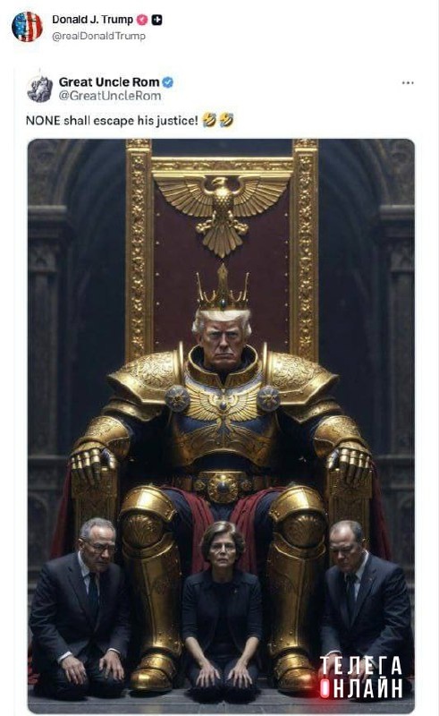 Никто не избежит его правосудия. Трамп репостнул в Truth Social картинку с собой в образе императора и кем-то, похожим то ли на демократов, то ли на европейских политиков, у его ног. Скромность — это не то, что украшает Дональда. #этимвсесказано 🚲 Подпишись на Телега Online