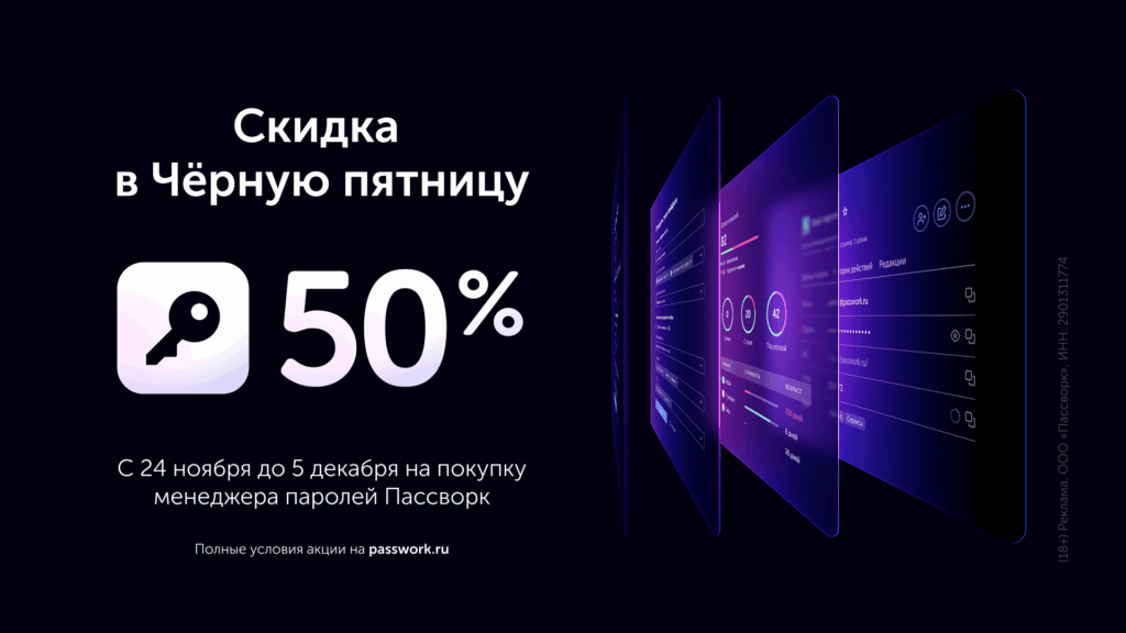 С 24 ноября по 5 декабря компания Пассворк проводит акцию в честь Чёрной пятницы — все версии коробочного решения для управления паролями будут доступны со скидкой 50%. Пассворк — комплексное решение для управления паролями и конфиденциальными данными, разработанное специально для компаний и государственных учреждений, которым критически важна безопасность и полный контроль над инфраструктурой. Решение обеспечивает централизованное хранение и управление всеми корпоративными секретами — от учётных записей и паролей до сертификатов и ключей. В отличие от облачных решений, все данные остаются на ваших серверах, что гарантирует полный контроль и соответствие требованиям информационной безопасности. Пассворк адаптируется под любые корпоративные требования и политики информационной безопасности. Решение разворачивается в изолированных офлайн-контурах и облачных средах. ООО «Пассворк» — российский разработчик ИБ-решений для управления паролями и конфиденциальными данными, специализирующийся н