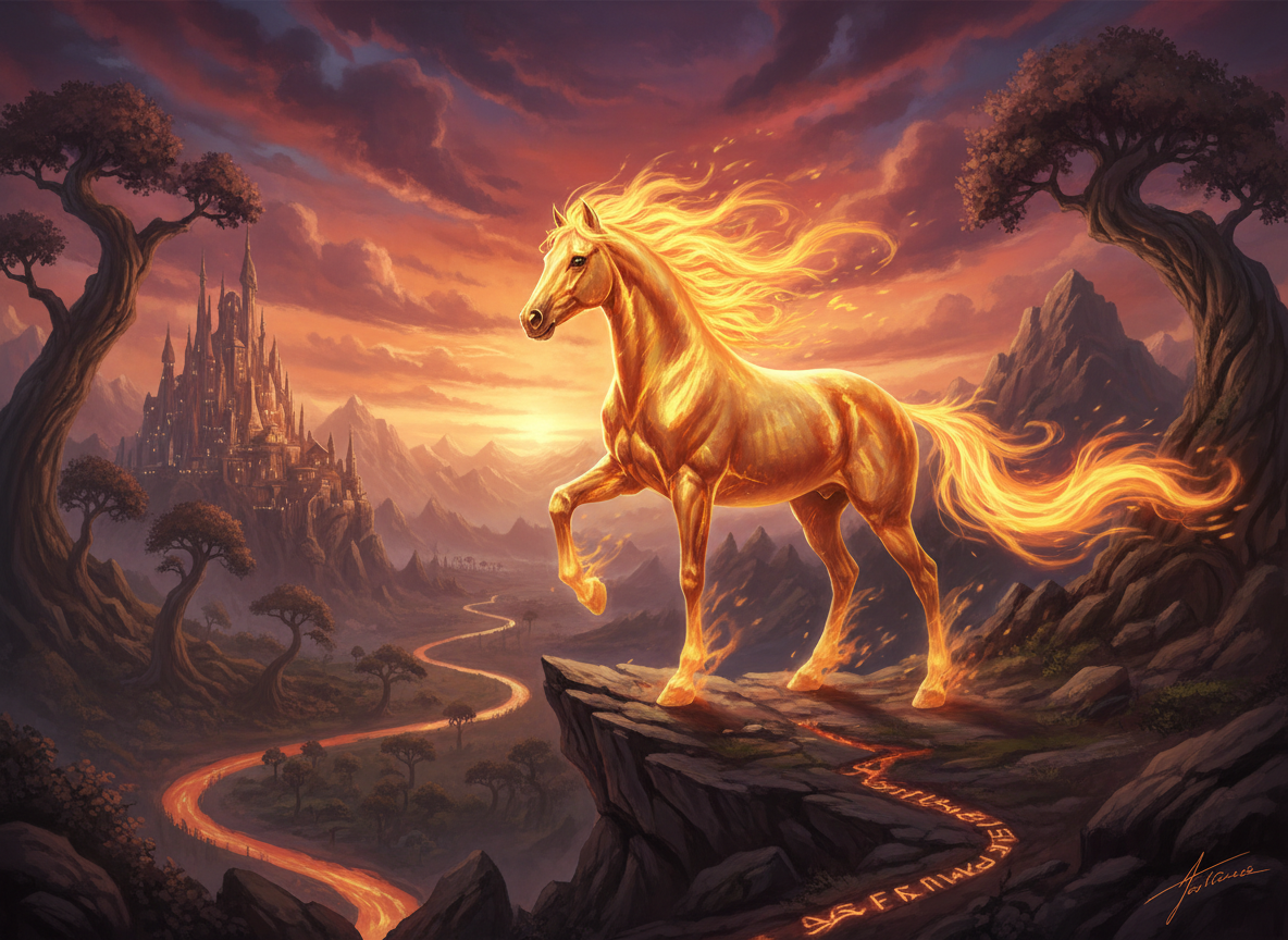 Говорят, много веков назад, когда ветры ещё умели разговаривать с людьми, а реки — петь, над северными степями появилась загадочная Лошадь, чья шерсть сверкала, словно расплавленное золото, смешанное с закатным огнём. Её звали Красной Огненной Лошадью, и никто не знал, откуда она пришла. Старые шаманы утверждали, что Лошадь родилась в сердце давно погасшего вулкана. В ту ночь небо вспыхнуло алым светом, и из кратера взвилось пламя, принявшее форму коня. Когда огонь осел, на чёрном камне стояло живое существо — величественное, дикое и прекрасное. Его грива пылала, будто языки огня, а копыта оставляли за собой искры. Говорили, что она была связью между миром людей и миром стихий. В каждом селении люди видели в ней разное. Одни считали Лошадь добрым знаком — предвестницей богатого урожая и громких побед. Другие — предупреждением о неизбежных испытаниях. Но одно было ясно всем: Красная Огненная Лошадь никогда не принадлежала никому. Тот, кто пытался оседлать её силой, получал ожог, который