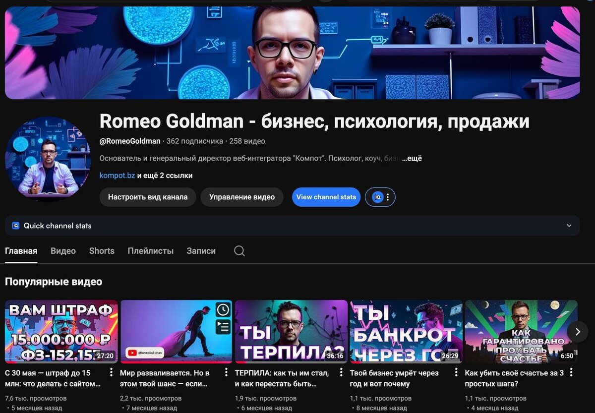 Моему каналу на YouTube сегодня исполнился год! Всё началось с того, что однажды мой товарищ посмотрел мой ютуб (старый) и сказал что мол у тебя хорошая есть тема - тебя кинул партнёр, проблемы в бизнесе, давай снимай. Люди такое любят. И дал пару советов “что делать”. Жена подарила мне палку стендикам и микрофон и вот всё - блоггер готов! Результаты у меня пока очень скромные: 362 подписчика 258 видео 167к просмотров Лучший ролик (про штрафы за перс.данные) набрал 7к просмотров и принёс много лидов, кстати говоря в бизнес. Вот мои выводы, если вы будете снимать что-то в том же направлении: 1. Shorts - мусорный трафик. Делается легко, но смысла нет. 2. Лучше всего заходят ролики про “боли” и “страхи”. В моём случае это боли и страхи предпринимателей, в том числе психологические боли. 3. Каналу нужна одна тема, основная тема через которую всё другое движется. Это сложно сделать и найти (я пока не нашёл) т.к. широкая тема слишком широкая и в ней много конкуренции, а узкая слишко