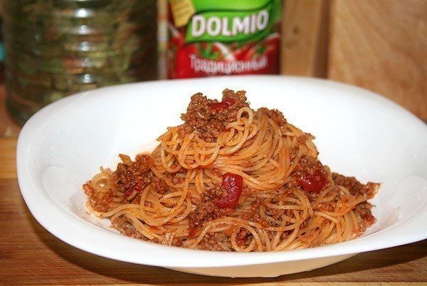 Ингредиенты: — 1/2 банки соуса — 250 грамм фарша — 2 зубка чеснока — 1 маленькая луковица — черный перец, соль, паприка — растительное масло Приготовление: Сначала спассеровала на растительном масле измельчённые лук и чеснок, добавила фарш и обжаривала на среднем огне 7 минут, затем добавила соус, слегка посолила, поперчила, добавила паприки и на маленьком огне тушила минут 10, как раз пока закипела вода для спагетти. Спагетти использовала самые тонкие, которые нужно варить всего 3 минуты, готовые спагетти аль денте добавила в сковороду к мясному соусу, перемешала и всё готово. Вот так примерно за 20 минут готов вкусный и сытный ужин.