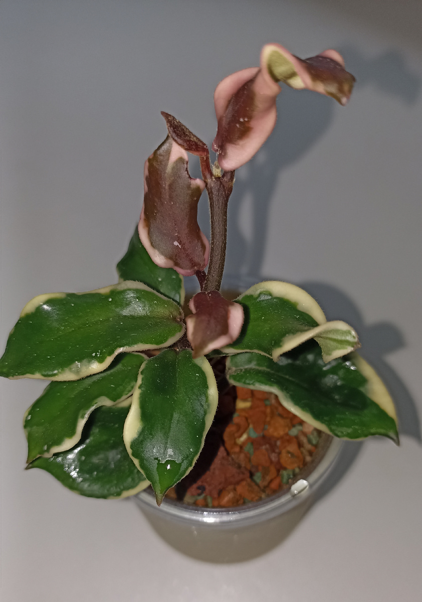Моя малышка, carnosa 'Holliana'. Та самая, которую взяла в "довесок" к заказу. Это было месяцев шесть-семь назад. Продавец предложила, я сначала решила, что она мне не нужна. Ну, я, если честно, просто не знала, что это за хойя. В конце диалога, когда уже заказ был сформирован, продавец снова предложила срезик этой малышки. Ну я и согласилась. Когда ко мне приехал заказ, не знала, что увижу. Но первое впечатление — было удивление. Совсем небольшие листики, очень плотные, какие-то изогнутые, ещё с ямками, как у Кринкл 8. Мне хойя показалась интересной. Укореняла сразу в минеральном грунте. В общем-то, до сих пор она в нём и живёт. Только недавно изменила объем стаканчика с 50 мл, на 100мл. Каждый новый узел — это восторг и восхищение. Цвет новых листочков совсем не как у других хойечек. Он не красный и не розовый. Цвет как будто тёмно-вишнёвый, бордовый, а иногда и цвет шоколада. А белая окантовка как раз розовая. Очень необычно и красиво. Активным темпом роста хойя не отличается. Н