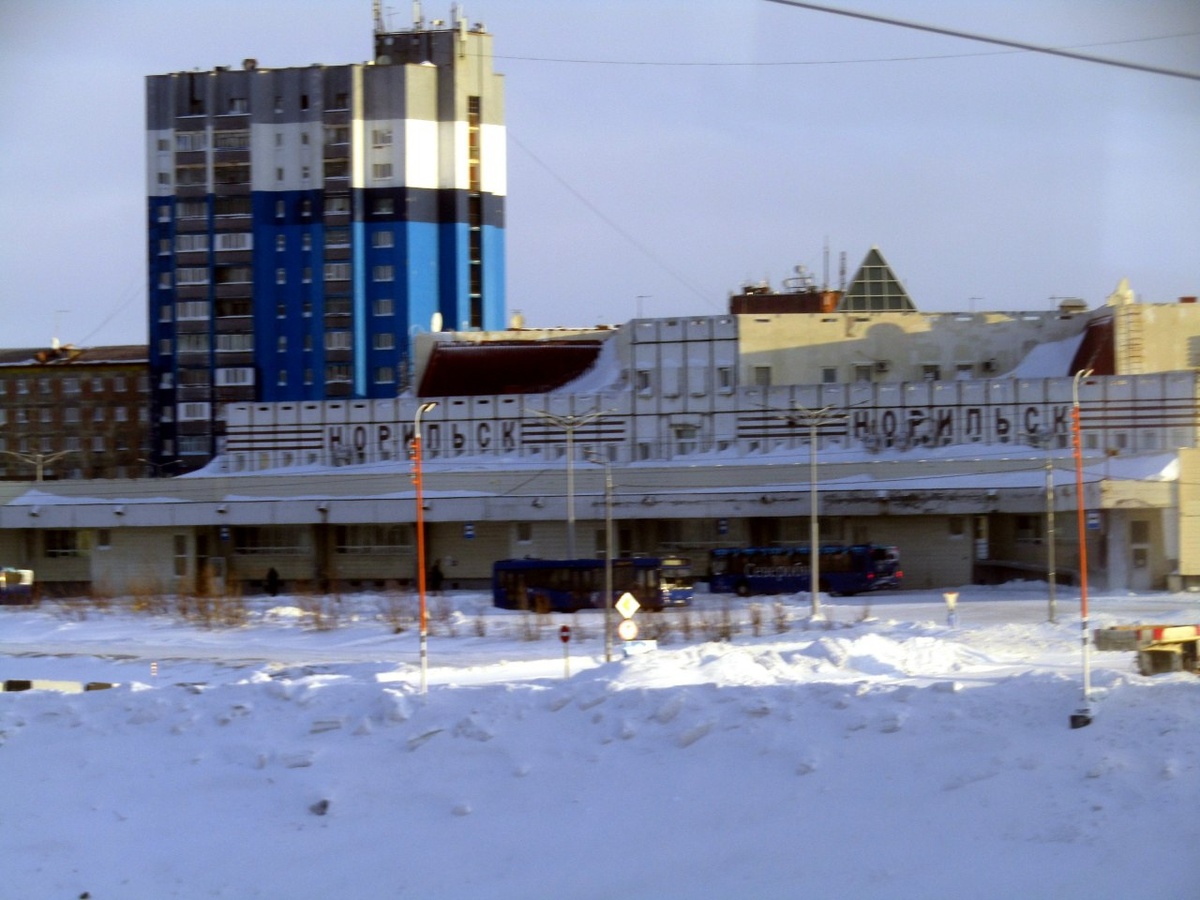 #Норильск В нашем понимании ездить из Норильска особо и некуда — местная сеть автодорог очень небольшая и единственный более-менее далёкий город, куда можно отсюда уехать — это 4-тысячная Дудинка в 100 километрах отсюда. Туда отправляется два "Пазика" в день. Однако автовокзал в городе есть. Он же административно-деловой центр (в нём местные "Госуслуги", "Мои документы" и прочие госорганизации), он же офисный центр, он же — что-то среднее между рынком и торговым центром, он же — конечная почти всех автобусов в Норильске. Отсюда отправляются северобусы в отдалённые районы (которые раньше были отдельными городами) Кайеркан, Талнах и Оганер, отсюда же раз в пару часов можно уехать в аэропорт (он в 40 километрах от города).