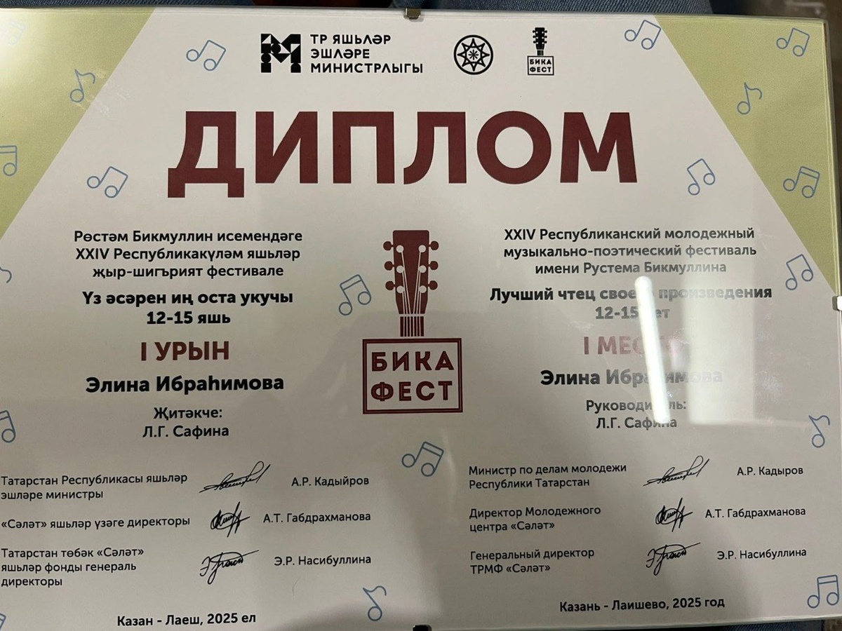 🌹Нәби Дәүли исемендәге Базарлы Матак гимназиясенең 9 б сыйныф укучысы Ибраһимова Элина XXIV Республикакүләм Рөстәм Бикмуллин исемендәге яшьләр җыр-шигърият "БикаФест" фестивалендә катнашты. Элина "Үз әсәрен иң оста укучы"номинациясендә 1 нче урынга лаек булды. Җитәкчесе туган (татар) тел һәм әдәбият укытучысы - Сафина Лилия.