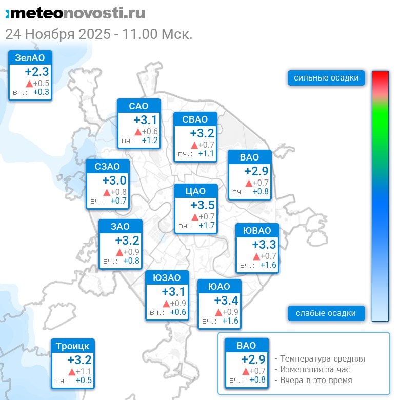 В 11:00 в Москве было от +2.2°C до +3.6°C, средняя температура +3.2°C #погода #Москва #осень #температура #24ноября #понедельник Перейти на сайт Прогноз погоды на 14 дней