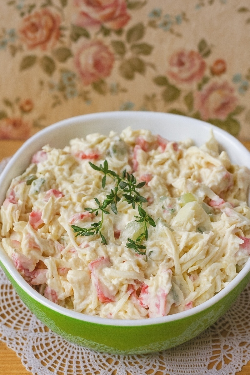 ИНГРЕДИЕНТЫ: ✅ крабовые палочки — 100 г ✅ плавленый сырок — 1 шт. ✅ яйца — 3 шт. ✅ огурец — 1 шт. ✅ майонез — по вкусу ✅ чеснок — 1–2 зубчика ✅ соль, чёрный перец — по вкусу ПРИГОТОВЛЕНИЕ: 1. Яйца и плавленый сыр натереть на тёрке. 2. Крабовые палочки и огурец нарезать кусочками. 3. Добавить майонез, пропущенный через пресс чеснок, посолить и поперчить. 4. Всё тщательно перемешать и подать к столу. ПРИЯТНОГО АППЕТИТА!