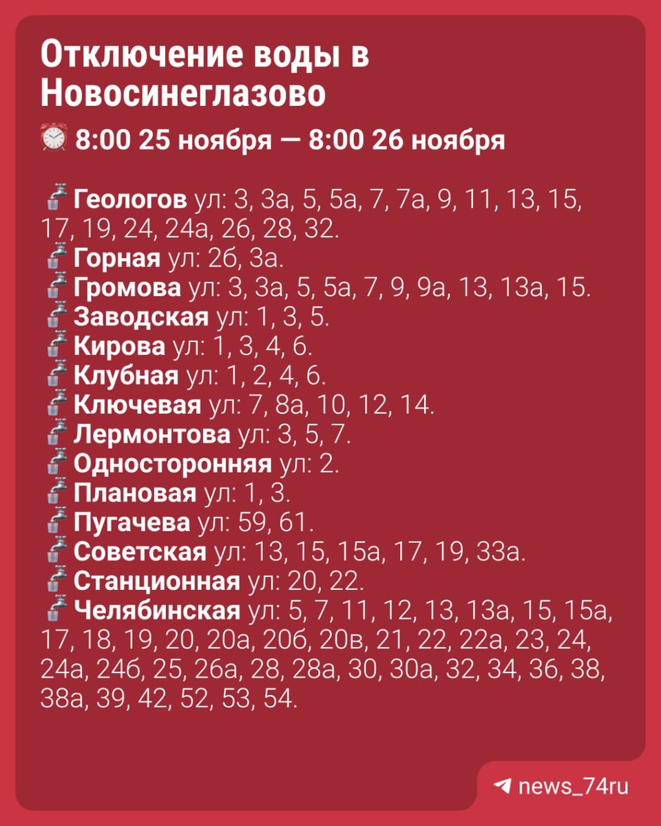 В Новосинеглазово на сутки отключат воду Как сообщили в МУП «ПОВВ», причина — плановый ремонт на водоводе. Отключение продлится с 8:00 25 ноября до 8:00 26 ноября. Жителей просят заранее запастись водой. Ситуация коснется порядка 100 домов, в том числе и частного сектора. Точные адреса — в карточке ⬆️