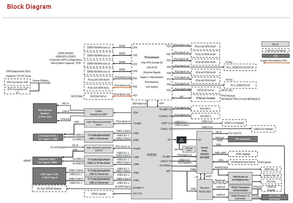В интернете появилась схема чипсета Intel W890, который разрабатывается для рабочих станций на базе Xeon 6 «Granite Rapids-WS
