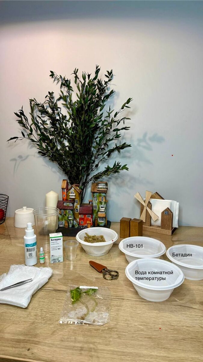 Не так давно я получила клон алоказии Веном🌱 В Интернете очень много разных инструкций. Решила поделиться с вами своей. К тому же, она уже доказала свою состоятельность 😉 От момента написания статьи прошло уже некоторое время, схема проверена и рабочая. Фото счастливого, здорового Венома в комментариях, я уже перевела его на воздух. Готовы? Поехали! Нам понадобятся: - хлоргексидин - бетадин - HB-101 или любой другой антистресс - 3 плошки с водой комнатной температуры - щипчики - мох сфагнум - маленький стаканчик - большой стакан с крышкой (или 2 стакана) 1. Обрабатываем хлоргексидином руки, ножницы и щипчики. 2. Открываем упаковку с клоном и кладем растение в первую миску с водой комнатной температуры для того, чтобы удалить остатки геля. Уберите щипчиками также все коричневые корни, остатки от листьев и вообще все, что потенциально может загнить. 3. Далее перекладываем клон (окунаем только корнями) в плошку с водой+4 капли бетадина. Пропорции на литр воды. Здесь держим 10 минут