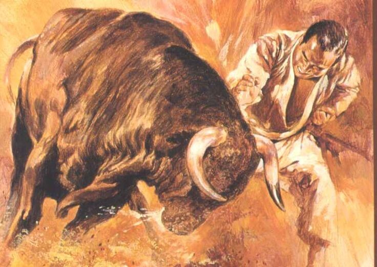 Сражения с быками - один из самых известных фактов биографии основателя киокушинкай каратэ Масутацу Оямы. Сосай утверждал, что за свою жизнь провел не менее 50-ти таких поединков и практически в каждом одержал победу. Животные были не только повержены, но и лишились рогов, которые Ояма отшибал ударом руки. Впервые идея проверить свою силу в сражении с быком появилась у Масутацу Оямы после отшельничества в горах. С ней он пришел на скотобойню. Рабочим стало интересно, что из этого выйдет. Первый бой оказался неудачным для мастера. Удар не сломил животное, а привел в бешенство. Но молодого Ояму это не остановило. В течение 7 месяцев он жил рядом со скотобойней и упражнялся в состязании с быками. В 1952 году японские “киношники” предложили Масутацу Ояма устроить показательную битву с быком. Съемку было решено провести в январе 1953 года на побережье Явата, вблизи города Татэяма. К этому поединку сосай усердно готовился, он изучал повадки животных, подбирал технику борьбы и сбрасывал вес,