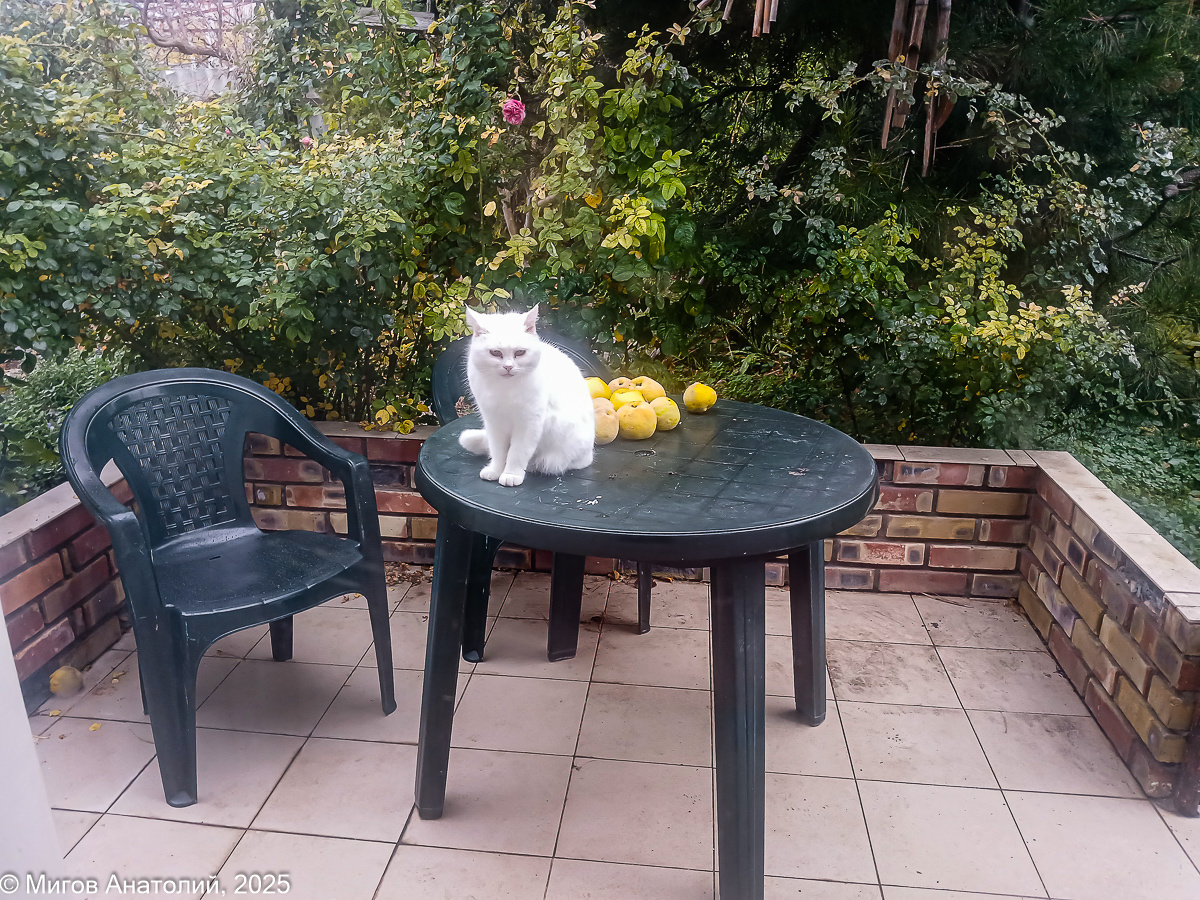 Пришла на террасу кошка Маруся. Забралась на стол, где лежат самые последние плоды айвы. Сидит, переглядывается с собакой Тильдой. С Марусей у Тильды особые отношения. Хоть дома, хоть на улице, Тильда никогда не станет гоняться за нашей Снежной Королевой. Степенно подойдет, дружелюбно помахивая хвостом, осторожно потычется носом в розовый Марусин носик, потопчется немного рядом, словно в ожидании чего-то, и потрусит дальше по своим делам. И сама Маруся ни робости, ни агрессии при встрече с Тильдой не проявляет. Полное понимание, что собака хотя и не сильно похожа на кошек, однако всё равно такой же член стаи. Других наших кошек Тильда, когда встречается с ними в доме, никак не обижает и даже не реагирует на них. И те тоже спокойно и с достоинством проходят мимо, едва не касаясь собачьего носа. Другое дело на улице. Тут Тильда, едва заметив Кокошку или Мамашу Че, со всех своих коротких ног мчится в их сторону, накручивая свой хвост словно пропеллер. Это у неё игра такая, проверять коше