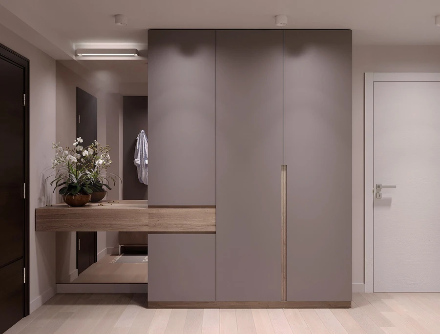 Выбирайте вытянутые неглубокие шкафы, чтобы уместить всё необходимое и при этом сохранить свободное пространство. Если семья небольшая или вы живете в квартире-студии, вместо шкафа можно использовать крючки на стену.