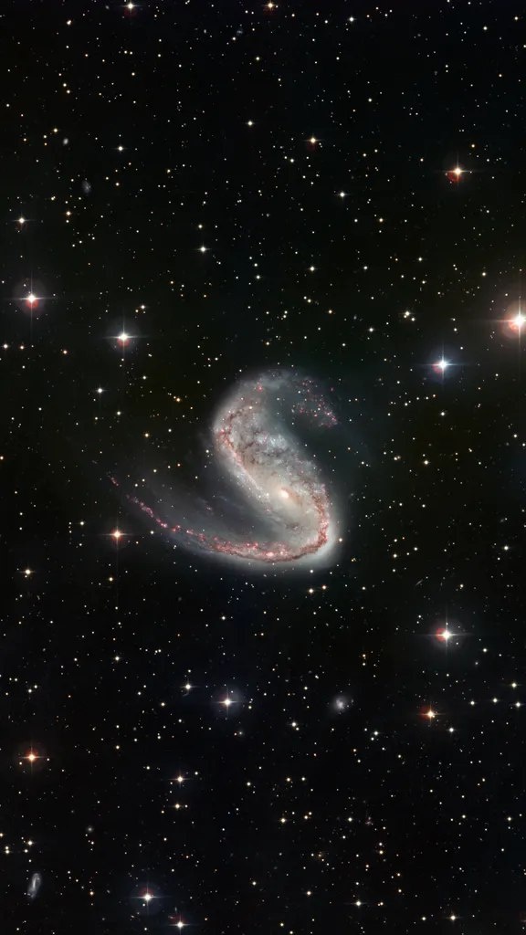 NGC 2442 Длинный розовый рукав галактики свидетельствует об интенсивном звездообразовании, когда молодые звезды ионизируют близлежащий газ. Ее неровная форма и активность, вероятно, являются результатом близкого столкновения с другой галактикой в прошлом.