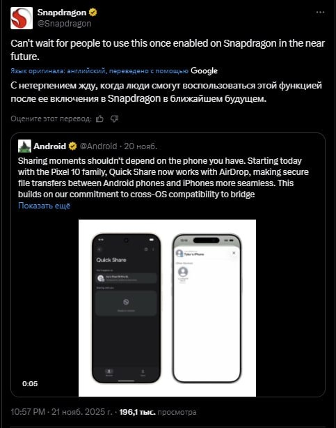 Qualcomm добавит в Android-смартфоны на Snapdragon обмен файлами с iPhone через AirDrop. Толчком стало обновление Quick Share, где Google добавила возможность передавать файлы между Android и iPhone в семействе Pixel 10. Пока деталей нет — неизвестно, какие модели в итоге получат поддержку и потребуется ли тесная работа Qualcomm с Google, чтобы обеспечить стабильность и безопасность.