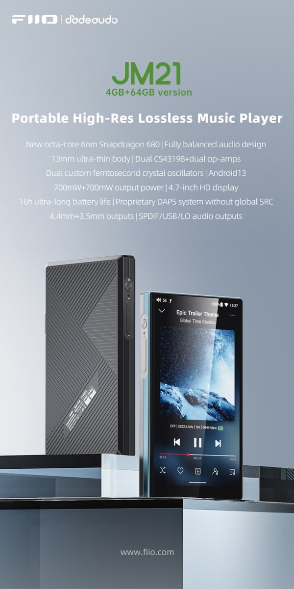 🎧 FiiO JM21 (4GB+64GB) — обновлённая версия плеера FiiO официально представила JM21 (4GB+64GB) — компактный hi-res плеер на Android 13 с улучшенной памятью и автономностью. 📦 Главные изменения vs 3GB+32GB: 💾 Память: 4 ГБ ОЗУ + 64 ГБ ПЗУ 🔋 Батарея: 3100 мА·ч ▶️ Single-ended: до 16 ч (+3,5 ч) 🎚 Balanced: до 12,5 ч (+3 ч) ⚙️ Кратко по железу: 🧠 8-ядерный Snapdragon 680 (6 нм) 🎼 Dual CS43198 + dual OPA 📱 4,7" HD-дисплей, Android 13 🎧 Выходы 4.4 мм + 3.5 мм, SPDIF / USB / Line Out