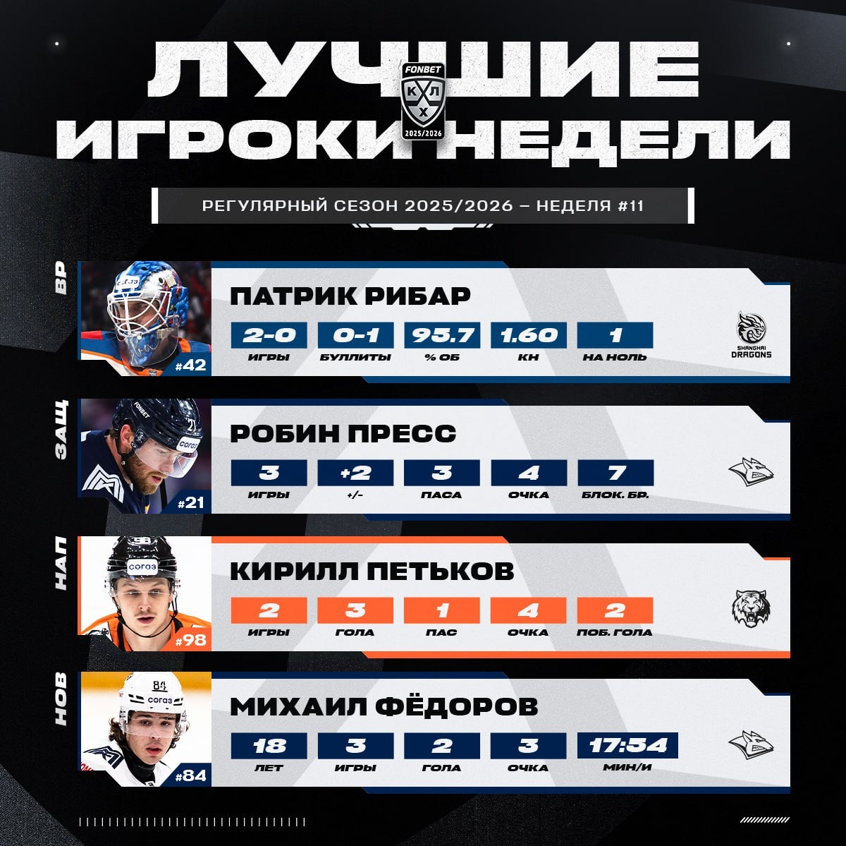 КХЛ представляет лучших игроков 11-й недели сезона 2025/2026.