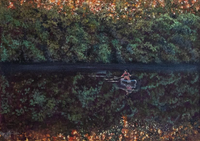 Экспозиция включает около трех десятков работ, выполненных в традиционной манере южной школы живописи. Здесь нет ярких эффектов или экспериментальных решений — наоборот, автор сосредоточена на внимательном наблюдении и естественной пластике природных форм. Основу выставки составляют пейзажи, в которых природа выступает самостоятельным персонажем. В картине «Отражение» (2023), подробно описанной в авторском каталоге проекта, почти весь холст занимает зеркальная поверхность Кубани. Фигура на лодке лишь отмечает человеческое присутствие, но не становится центром композиции. Выбранный художественный прием — дробный мазок, приглушенная цветовая палитра — позволяет сосредоточиться не на событии, а на состоянии. Такой подход характерен для Хаустовой: пейзаж у неё превращается в способ осмысления пространства, а не его документальную зарисовку. В работах художницы пейзаж, портрет и натюрморт существуют не раздельно, а как элементы единой среды. Портрет «Мама» (2020) строится на сочетании образ