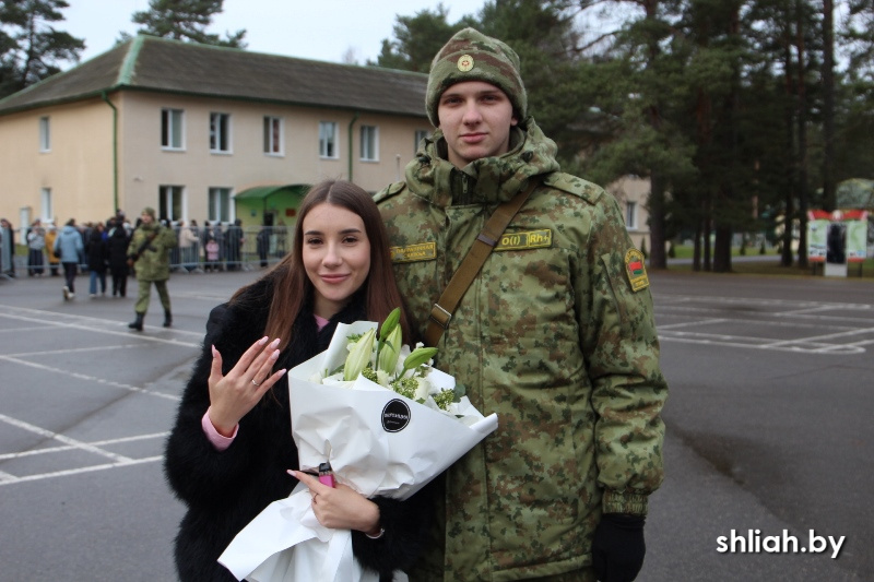 День принятия присяги – несомненно, одно из значимых событий в жизни мужчины. Для новобранца Дмитрия КЛИМОВИЧА дата 22 ноября стала двойным праздником. В день принятия присяги в учебный центр Института пограничной службы к Дмитрию со Смолевичского района приехали его родные и близкие. Во время встречи в присутствии родителей молодой человек сделал предложение руки и сердца своей возлюбленной Анастасии. Он подарил ей кольцо и букет цветов. Девушка ответила согласием. Впереди у солдата - полтора года службы. Всё это время его будет согревать мысль о том, что дома ждет любимая невеста. Оксана ГЕЙБОВИЧ Фото автора Теги: общество присяга