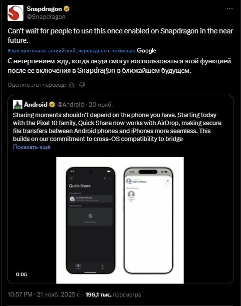 Qualcomm собирается внедрить в Android-смартфоны на базе Snapdragon функцию обмена файлами с iPhone через AirDrop. Инициатором этого стала модернизация Quick Share, благодаря которой Google добавила возможность передачи файлов между Android и iPhone в серии Pixel 10. Пока деталей не раскрыли — неизвестно, какие именно модели получат поддержку и потребуется ли тесное сотрудничество Qualcomm с Google для обеспечения надежности и безопасности. @techogid