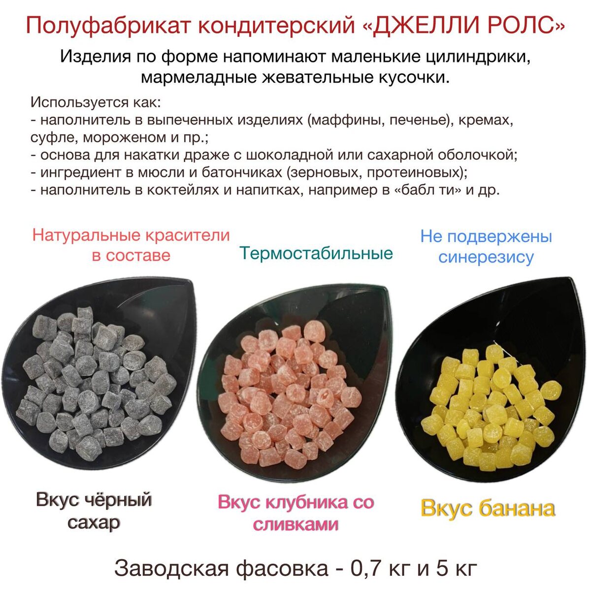 Новинка нашего производства ПК Фабрика сладкого декора «Джелли ролс» - готовый полуфабрикат жевательной консистенции, вырабатывается в виде маленьких цилиндров, калиброванных по размеру: - 6/8мм - 8/10мм - 10/12мм ✨ Имеет цвет, вкус и аромат в соответствии с наименованием. ✨ Полуфабрикат термостабильный (в выпечке и заморозке). ✨ Не подвержен синерезису. ✨ Не передает цвет основе, в которую добавляется. ✨ Окрашен натуральными красителями. Используется как: - наполнитель в выпеченных изделиях (маффины, печенье), кремах, суфле, мороженом и пр. - основа для накатки драже с шоколадной или сахарной оболочкой. - ингредиент в мюсли и батончиках (зерновых, протеиновых). - наполнитель в коктейлях и напитках, например в «бабл ти» и др. Для тестирования продукта мы предоставляем образцы бесплатно . Контакты для связи: 🌍 www.tdfsd.ru ☎️ 8 (495) 575-34-35 📩 sale@tdfsd.ru