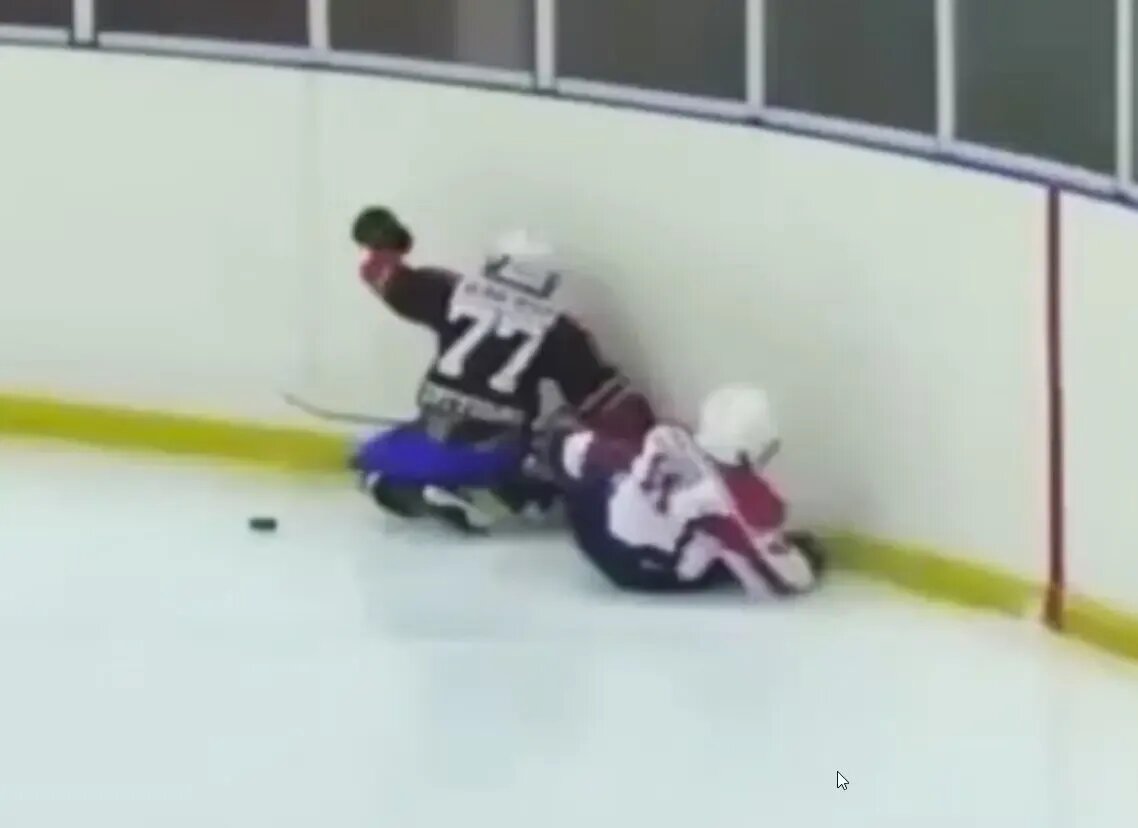 Мальчика толкнули в спину, когда он ехал за шайбой. Спортсмен упал и врезался в борт головой.