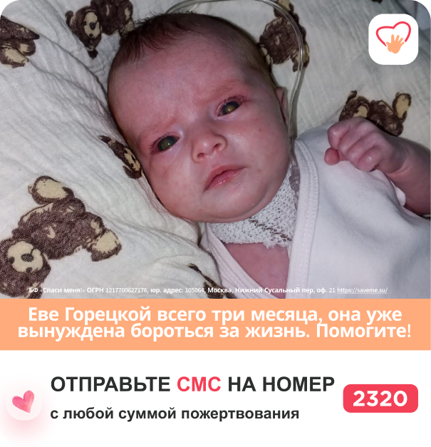 Еве Горецкой всего три месяца, она уже вынуждена бороться за жизнь. Оба глаза поразил один из агрессивнейших видов рака. В России предложили их удалить, но и это не дает никакой гарантии. «От врачей прозвучало то, к чему невозможно подготовиться: после второго курса потребуется энуклеация… обоих глаз. Я спросила, может хотя бы один глаз можно сохранить? Увы, даже такой вариант нам не предложили», – рассказывает Ирина, мама Евы. Друзья, сердце разрывается, когда видишь такую маленькую, такую хрупкую жизнь в опасности. Всего 3 месяца назад на свет появилась Ева. Ей так нужны мамина улыбка, солнечные зайчики на стене и яркий мир вокруг. Но этот мир для неё может навсегда исчезнуть. Мы не смогли пройти мимо. И сейчас открываем новый сбор для малышки Евы. В Швейцарии, в центре Jules Gonin, врачи умеют лечить её тяжёлый диагноз. Их методы позволяют спасти не только жизнь, но и самое ценное – зрение. Но одна огромная преграда стоит на пути к спасению – деньги. У семьи нет даже суммы, чтобы на