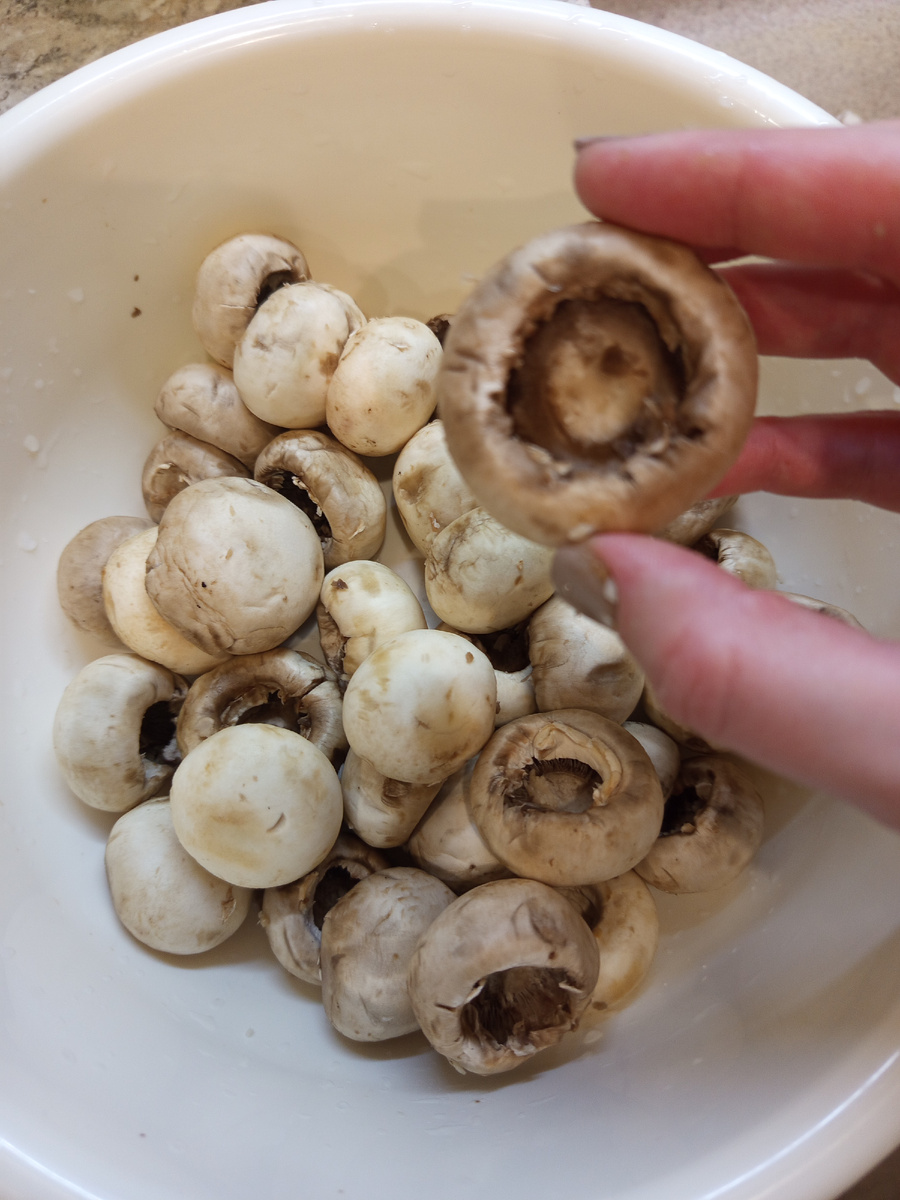 Бюджетно, вкусно, красиво. 👍 Блюдо универсальное - можно подать, как горячее блюдо, как горячую закуску, если остыло, то добавить лист салата и помидорку черри на шпажки- получится холодная закуска. Шампиньоны купила "-40%", получается вообще халява . Из шляпок вынимаем ножку, я это делаю ручкой чайной ложки. Очень удобно и маникюр не портится. Посыпаем шляпки солью и любимыми специями. У меня универсальная приправа на основе паприки из лавки со специями на развес. Включаем духовку прогреваться, а шляпки оставляем в сторону- пусть маринуются. Кстати, ножки не выкидываем, они пригодятся для другого рецепта. Убираем в контейнер и в холодильник. Лук режем мелким кубиком. И обжариваем до золотистого цвета. В фарш отправляем соль, перец, чеснок и лук. Хорошенько вымешиваем. Сыр трем на мелкой терке. Наполняем шляпки мясной начинкой. Если у вас большие грибочки, то под мясо можно положить по маленькому кусочку сыра. Посыпаем сыром и отправляем в духовку на 190-200 градусов, примерно на 30