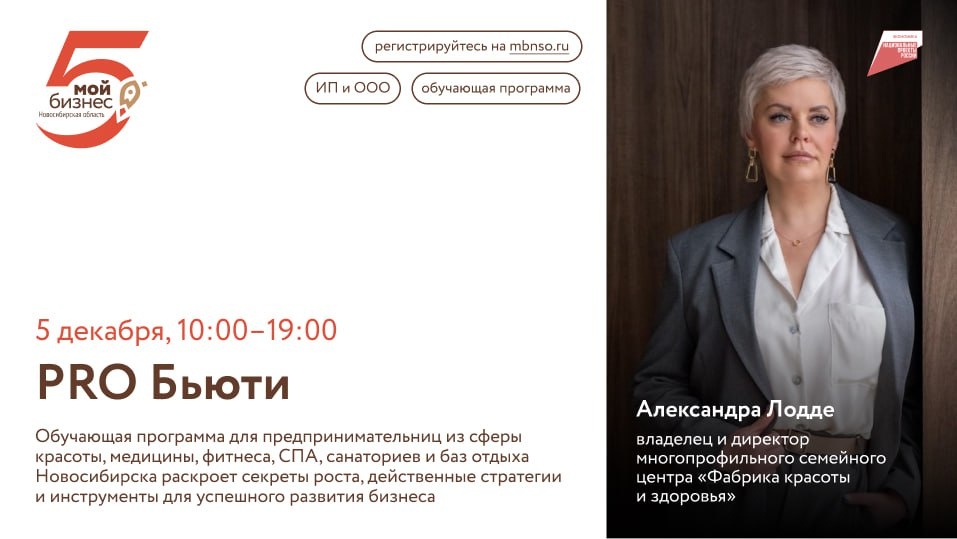 Обучающая программа «PRO Бьюти» для предпринимательниц из сферы красоты, медицины, фитнеса, СПА, санаториев и баз отдыха На обучении вы: — научитесь распределять время между работой, физическим состоянием и здоровьем — узнаете, как создать яркий и запоминающийся образ предпринимателя — поймете закон денег: от управления до оптимизации — освоите приемы эффективной рекламы, продвижения, сегментации клиентов и выстраивания теплых отношений с ними — узнаете, как искать выгодные партнерства и коллаборации — изучите методы публичных выступлений, владения голосом и жестами — получите консультацию от успешных бизнесменов ❗️Мероприятие для ИП и ООО Когда: 5 декабря, 10:00–19:00 Где: центр «Мой бизнес» (ул. Сибревкома 9) Для участия нужна регистрация на сайте Вход по уникальному QR-коду, отправим накануне в смс/на почту ✈️@mbnso господдержка бизнеса ✅Связаться с нами написать: ВКонтакте, сайт позвонить: 8 800 600 34 07 #ИПиООО