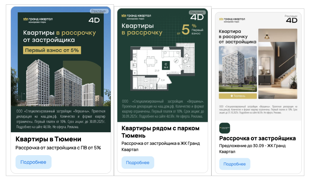 В Тюменской области лучший результат показал креатив с обобщенным текстом. В нем не было деталей по первоначальному взносу. Акцент сделали на ограниченный срок акции – до конца месяца. Такой подход минимизировал барьеры для аудитории. Он стимулировал быстрые решения и повышал вовлеченность. Стоимость квалифицированной заявки оказалась в два раза ниже, чем у других креативов.