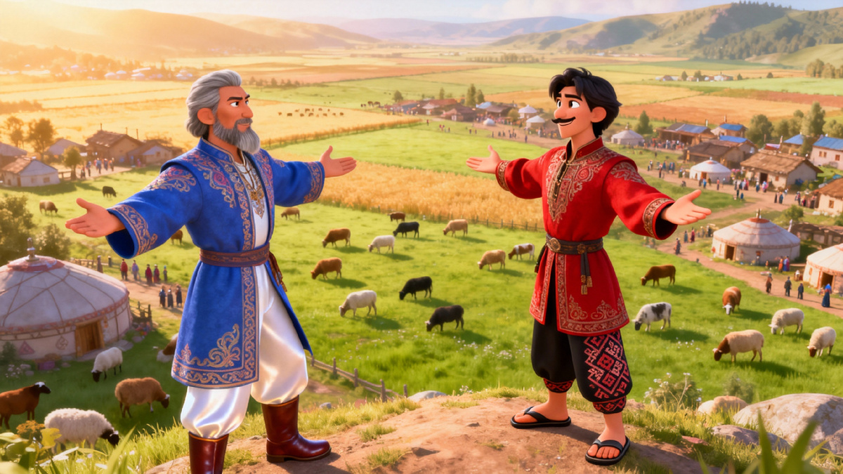 Жили когда-то в одном ауле два хана. Богаты были оба — что первый, что второй, — и оба не меньше друг друга хвастались своим достатком. Часто навещали друг друга, сравнивали стада и беседовали о хозяйстве. Однажды к первому хану пришёл молодой парень из далёкого аула. — Возьми меня пастухом, — попросил он. Первому хану пастух как раз был нужен. Парень ему понравился: скромный, честный с виду. Хан повёз его к своим огромным стадам и сказал: — Вот моё богатство. Смотри за ним. Я доверяю тебе. А сам, успокоенный, перестал ездить на пастбища — всё казалось надёжным и спокойным. Увидел это соседний хан и с завистью сказал: — Ты будто в раю живёшь: ни забот, ни тревог. На пастбища и не заглядываешь. — Зачем? — ответил первый хан. — Теперь я могу быть спокоен. Пока мой пастух жив — не узнаю бедности. Он честный человек, не скажет ни единой лжи. Соседний хан усмехнулся: — А если я заставлю его солгать? Что тогда? — Если заставишь — отдам тебе весь мой скот. Если нет — ты отдашь мне свой. — До