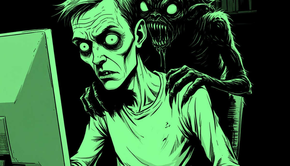 Я начал видеочат, ожидая, что Джеймс, как обычно, присоединится, выключив камеру. Но вместо этого на экране появилось его лицо. Он был похож на скелет. Его глаза тоже были совершенно белыми. Но что ещё более странно, на его плече сидел уродливый человечек с крючковатым носом и большими белесыми глазками, который тянул его за волосы.