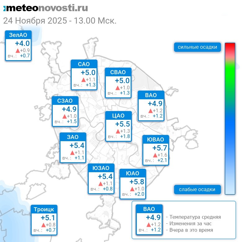 В 13:00 в Москве было от +3.5°C до +6.1°C, средняя температура +5.2°C #погода #Москва #осень #температура #24ноября #понедельник Перейти на сайт Прогноз погоды на 14 дней