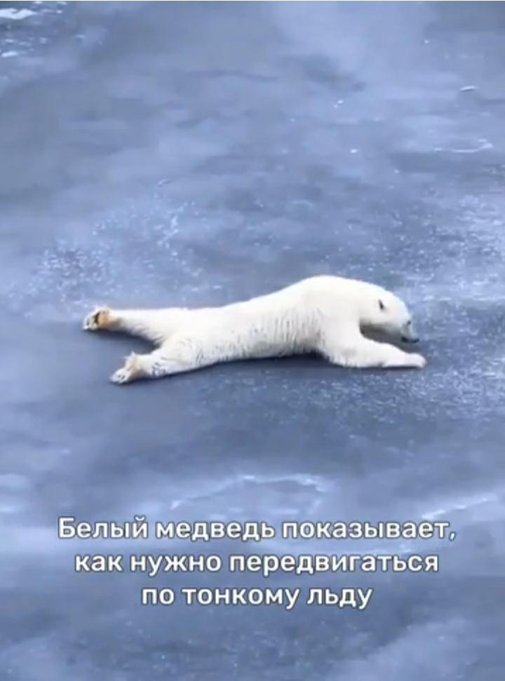 МЧС Башкирии опубликовало видеоролик, на котором белый медведь показывает образец передвижения по тонкому льду. На замёрзшем водоёме косолапый ложится на живот и, подгребая передними лапами, ползёт к противоположному берегу. Именно так, по мнению спасателей, необходимо передвигаться и людям по тонкому льду. Также специалисты МЧС дают несколько советов, в случае, если лёд под человеком всё же проломился.