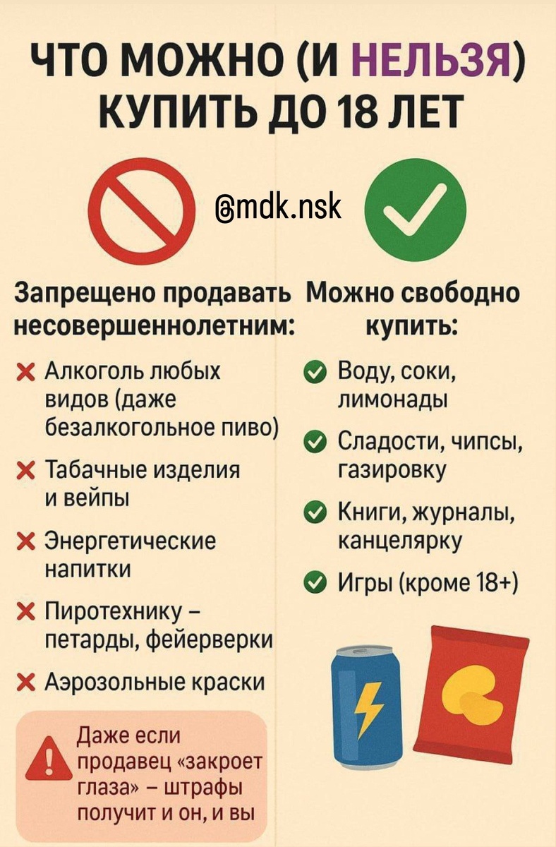⛔️ Что запрещено продавать подросткам до 18 лет? Законы действуют либо во всех регионах России, либо частично. Запрещено продавать несовершеннолетним: 🍾 алкоголь любых видов (даже безалкогольное пиво); 🚬 табачные изделия и вейпы; 🔋 энергетические напитки (во многих регионах); 🧨 пиротехнику — петарды, фейерверки; 🧪 аэрозольные краски (в ряде регионов). ☝🏻Даже если продавец «закроет глаза» — штрафы получит и он и вы. Помимо этого, разрабатывается законопроект, который запретит продажу алкоголя лицам до 21 года. 👉 Подписаться на канал