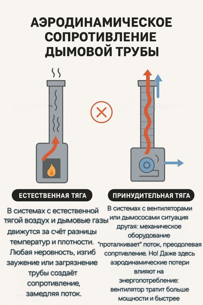 В системах с естественной тягой воздух и дымовые газы движутся за счёт разницы температур и плотности. Любая неровность, изгиб, заужение или загрязнение трубы 🪵 создаёт сопротивление, замедляя поток.